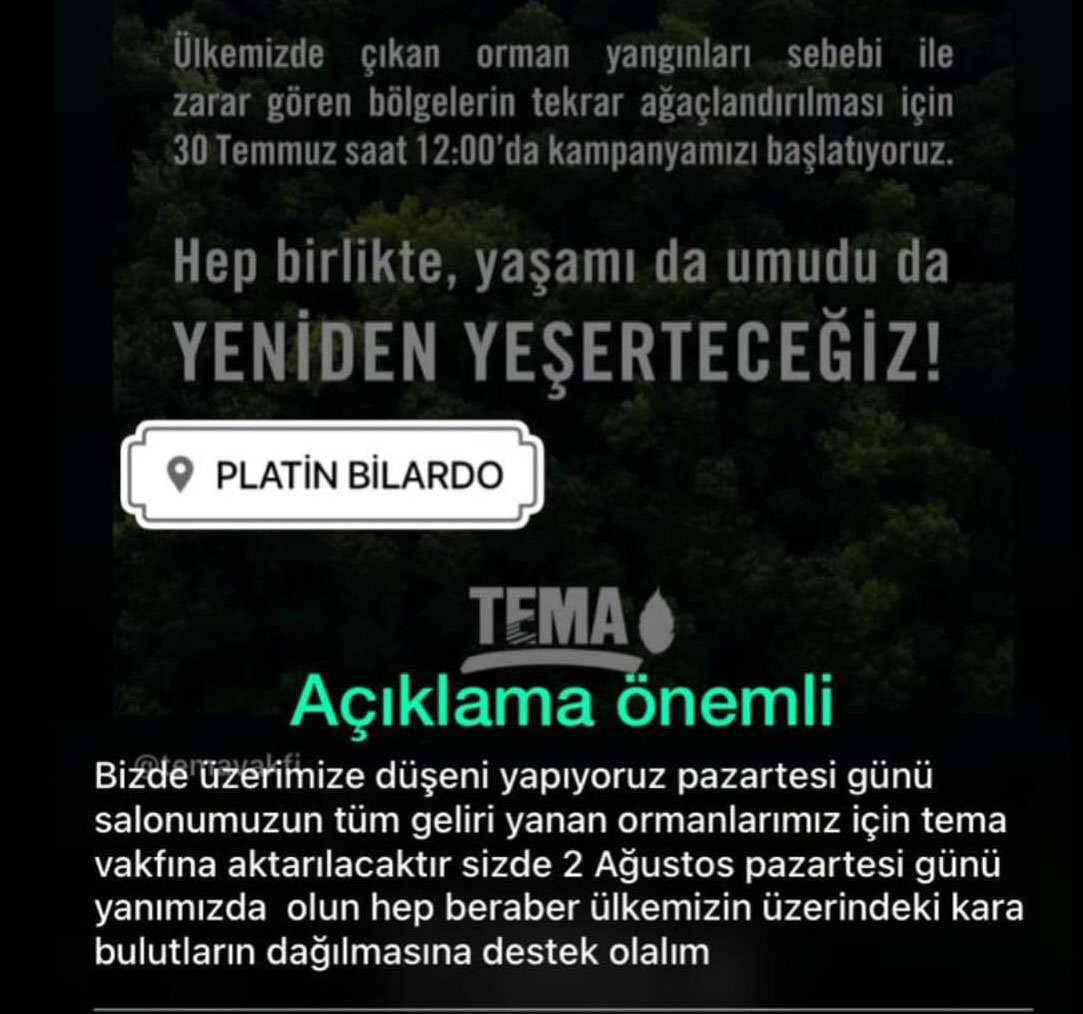 Alınan bilgilere göre, "Hep birlikte, yaşamı da umudu da YENİDEN YEŞERTECEGİZ!" sloganı altında sorumluluk üstlenen Platin Bilardo Cafenin, zarar gören ormanların ağaçlandırılması için 2 Ağustos Pazartesi günkü elde edeceği tüm gelirini TEMA Vakfına aktaracağı öğrenildi. Haber: Özgür Evliyaoğlu- Ardahan Haber