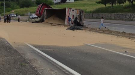Bingöl'de buğday yüklü tır, sürücüsünün direksiyon hakimiyetini kaybetmesi sonucu devrildi. Kazada buğdayların yola savrulması nedeni ile trafik akışında aksamalar meydana geldi.
