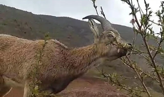 Elazığ'ın Palu ilçesine bağlı Arındık köyünde bir dağ keçisi, evin duvarına tırmanarak ağaç dallarını yemeye başladı. O anlar, köy korucusu Engin Yamanoğlu tarafından cep telefonu kamerasıyla kaydedildi. Dağ keçisinin rahat tavırlarla dalları yemesi izleyenlerin ilgisini çekti.