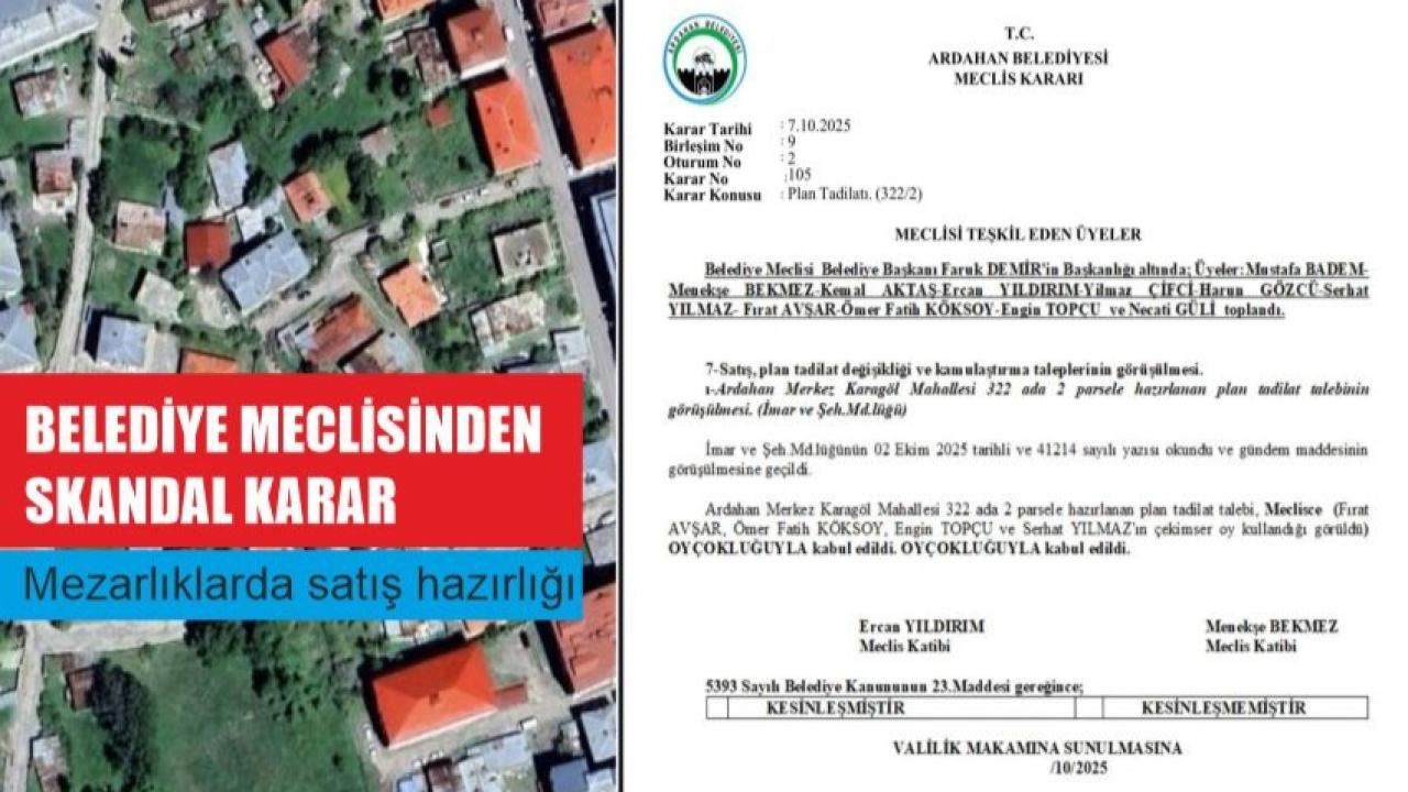Ekim ayı Belediye Meclis toplantısında gündeme gelen ve CHP’li meclis üyelerinin oylarıyla karara bağlanarak Ardahan Valiliğine gönderilen tutanakta, Karagöl Mahallesi 322 parseldeki mezarlığın imara açılacağı ortaya çıktı.