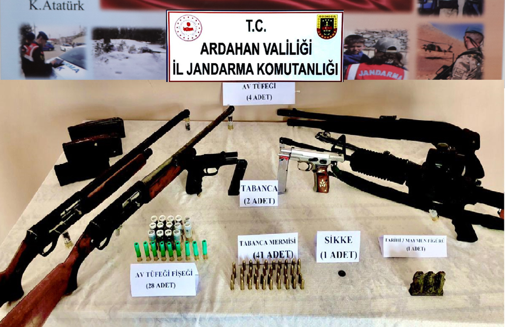Ardahan İl Jandarma Komutanlığınca yapılan istihbarı çalışmalar neticesinde; Göle İlçesi Durançam ve Yanatlı köylerinde ikamet eden 3 şahsa ´Silah ve tarihi eser kaçakçılığı´ suçuna yönelik teknik ve fiziki takip gerçekleştirdi. Gerçekleştirilen operasyonlarda 3 ayrı adreste arama yapıldı. Aramalarda, 2 adet ruhsatsız 9 mm. çapında tabanca, 4 adet ruhsatsız av tüfeği, 41 adet 9 mm. tabanca mermisi, 28 adet av tüfeği fişeği, 1 adet sikke ve 1 adet tarihi değeri olduğu değerlendirilen obje ele geçirildi. Gözaltına alınan 3 şüpheli sevk edildiği adli makamlarca ifadelerinin ardından serbest bırakıldı.