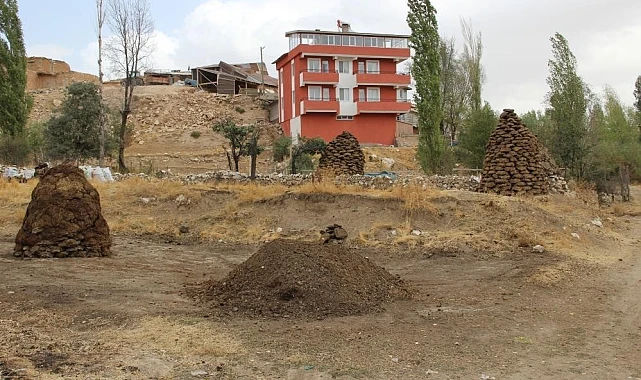 Erzincan'da köyde yaşayan vatandaşlar kış öncesi yakacak için tezekleri hazır etti.