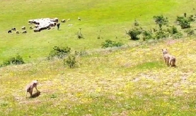Erzincan'da iki kurt yaylada otlayan koyun sürüsüne, kavalı bırakıp drone ile sürü güden çoban ise kurtlara pusu attı.