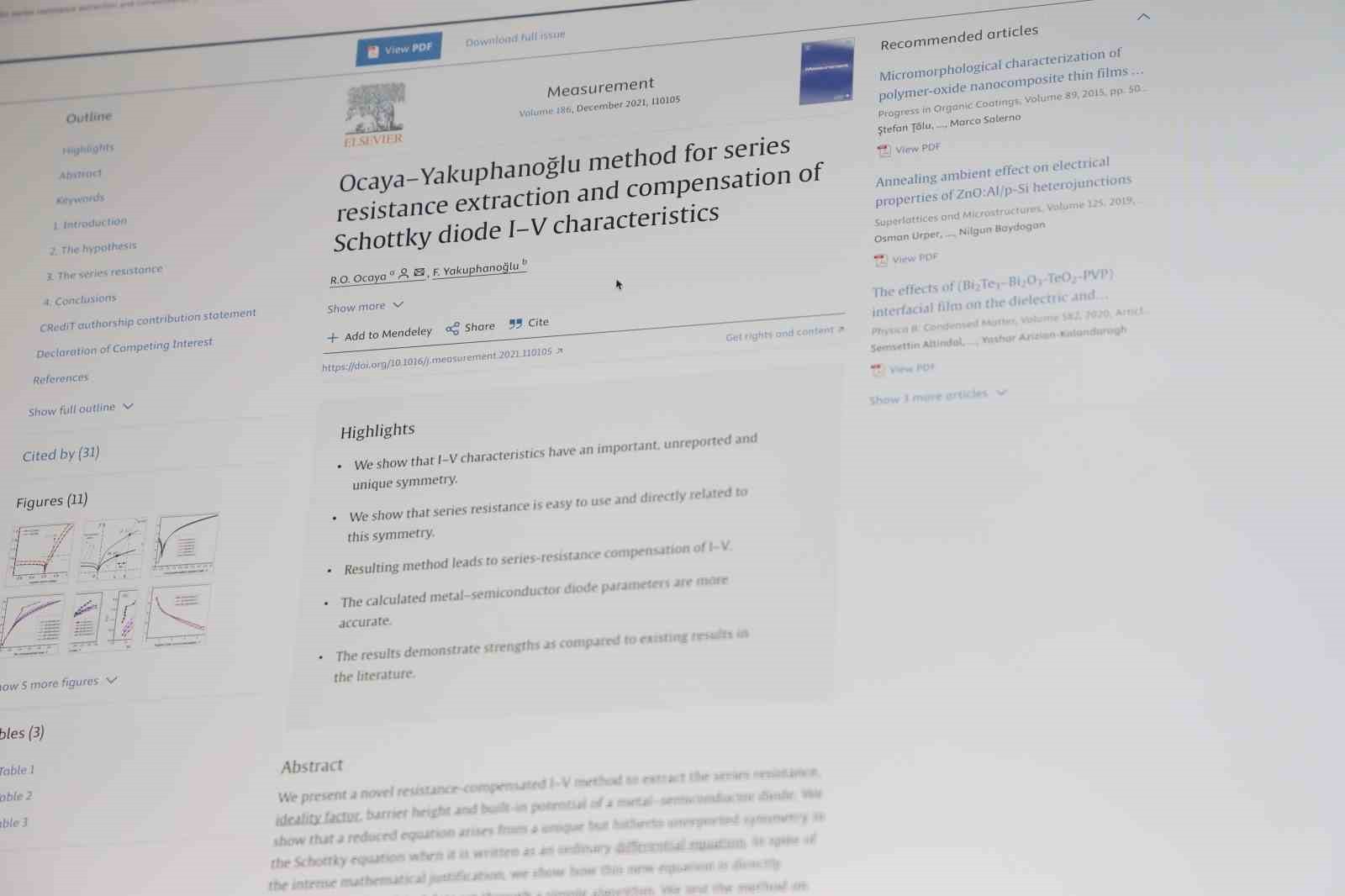 Fırat Üniversitesi (FÜ) Fizik Bölümü Öğretim Üyesi Prof. Dr. Fahrettin Yakuphanoğlu yaptığı açıklamada, diyot, fotodiyot ve güneş pili gibi elektronik cihazların seri direncini hesaplamak için Ocaya-Yakuphanoğlu adlı yeni bir seri direnç metot geliştirdiklerini belirtti.