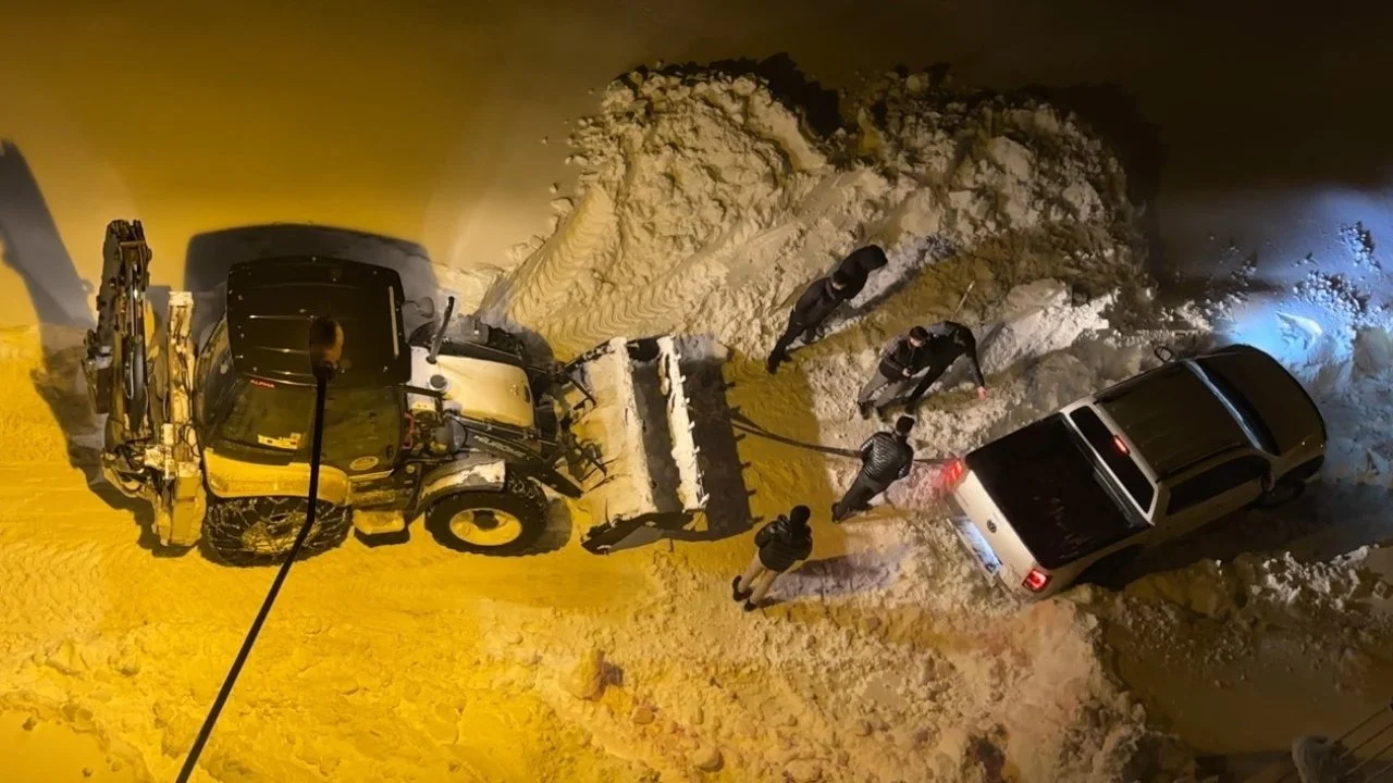 İlçede bir aydır etkisini sürdüren yoğun kar yağışı, günlük yaşamı olumsuz etkilemeye devam ediyor. Kar kalınlığının yüksek kesimlerde 2 metreye, ilçe merkezinde ise 1 metreye ulaştığı bölgede ulaşımda aksamalar yaşanıyor. Esentepe Mahallesi’nde seyreden bir kamyonet, yoğun kar ve tipi nedeniyle kara saplanarak mahsur kaldı. Çevredeki vatandaşların yaklaşık 2 saat süren kendi imkanlarıyla aracı kurtarma çabaları sonuçsuz kaldı. Durumun bildirilmesi üzerine bölgeye Yüksekova Belediyesi karla mücadele ekipleri sevk edildi. İş makinesi bölgede yol açma çalışması yapan ekipler, saplandığı yerden çıkardıkları aracı güvenli alana ulaştırdı.